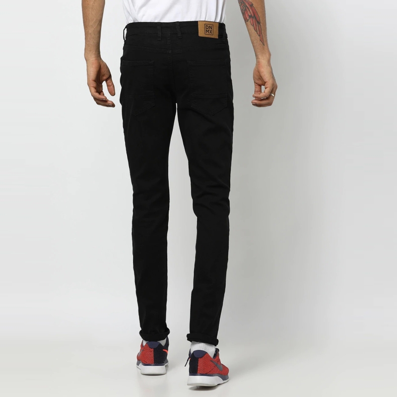 Black dark wash 5-pocket mid-rise jeans, clean look, no fade, has a button and zip closure, and waistband with belt loops